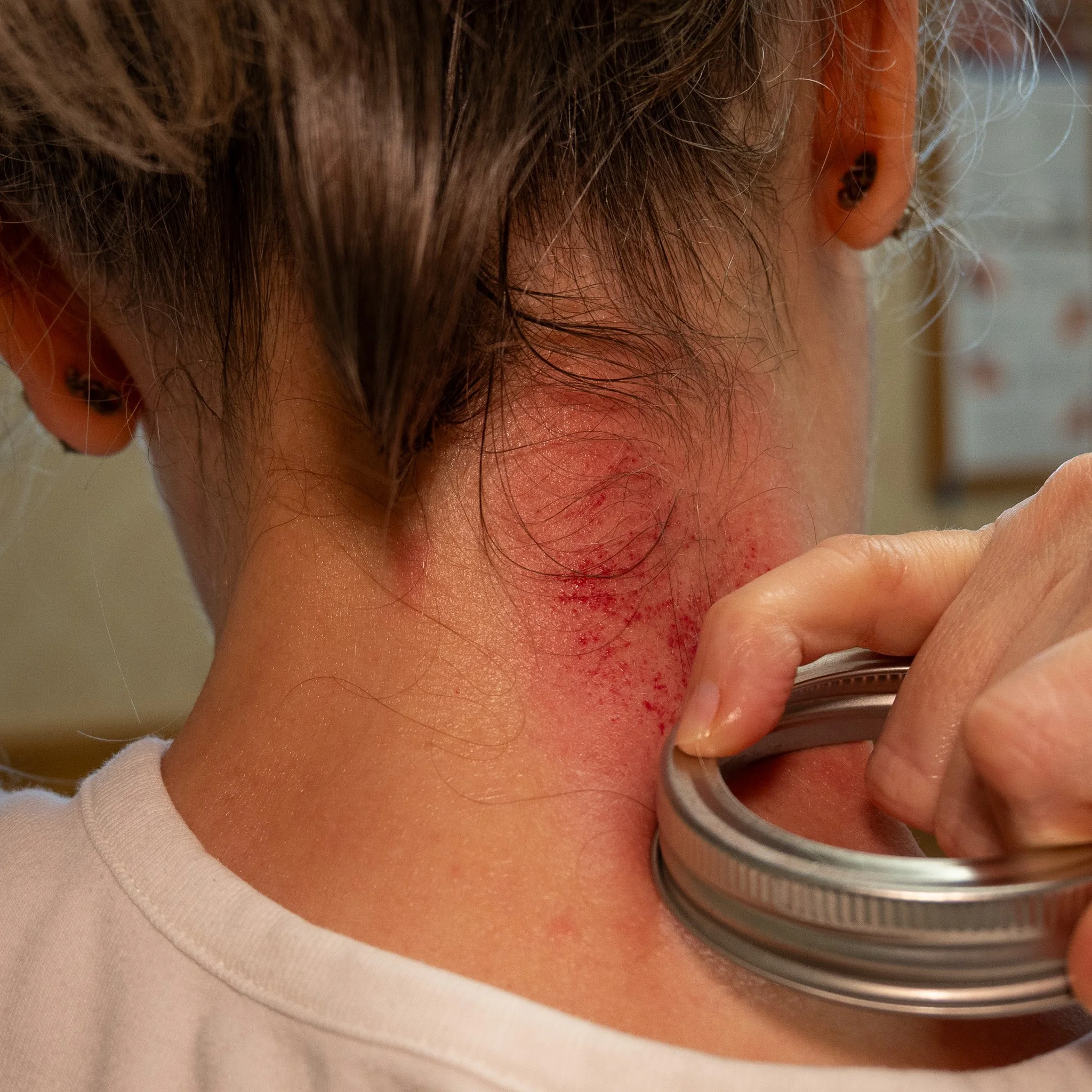 A smooth-edged tool is used to draw toxins to the surface, clearing inflammation and releasing fascial adhesions throughout the body.